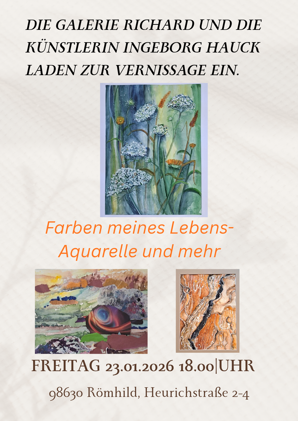 GalerieRichard Aktuelle Ausstellung Ingeborg Hauck-Vernissage am 23.01.26 Martin Abe- 1. OG Galerie Richard Heurichstraße 2–4 · 98630 Römhild Samstag 9–12 Uhr, nach Vereinbarung und zum Beispiel bei Events wie dem Römhilder Keramikmarkt